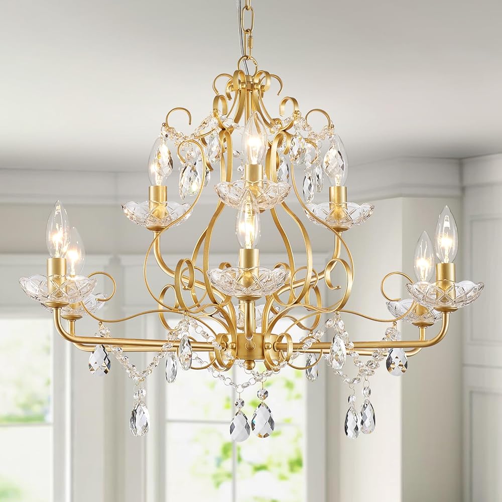 WUZUPS 9-Light Crystal Candle Chandelier Pendant Flushmount Ceiling Light Modern Lighting Fixture for Bedroom Hallway Bar Kitchen Bathroom, H 18.1" x W 25.6", Gold, E12 Base