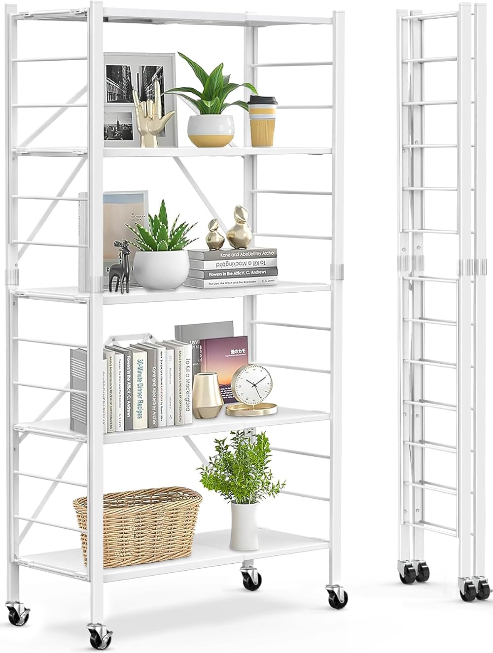 5 Tier Foldable Storage Shelves, Expandable Folding Pantry Shelf with Wheels, Changeable into 2 Shelf Units, Collapsible Storage Rack Metal Shelves for Storage, Kitchen, Room, Office, Garage