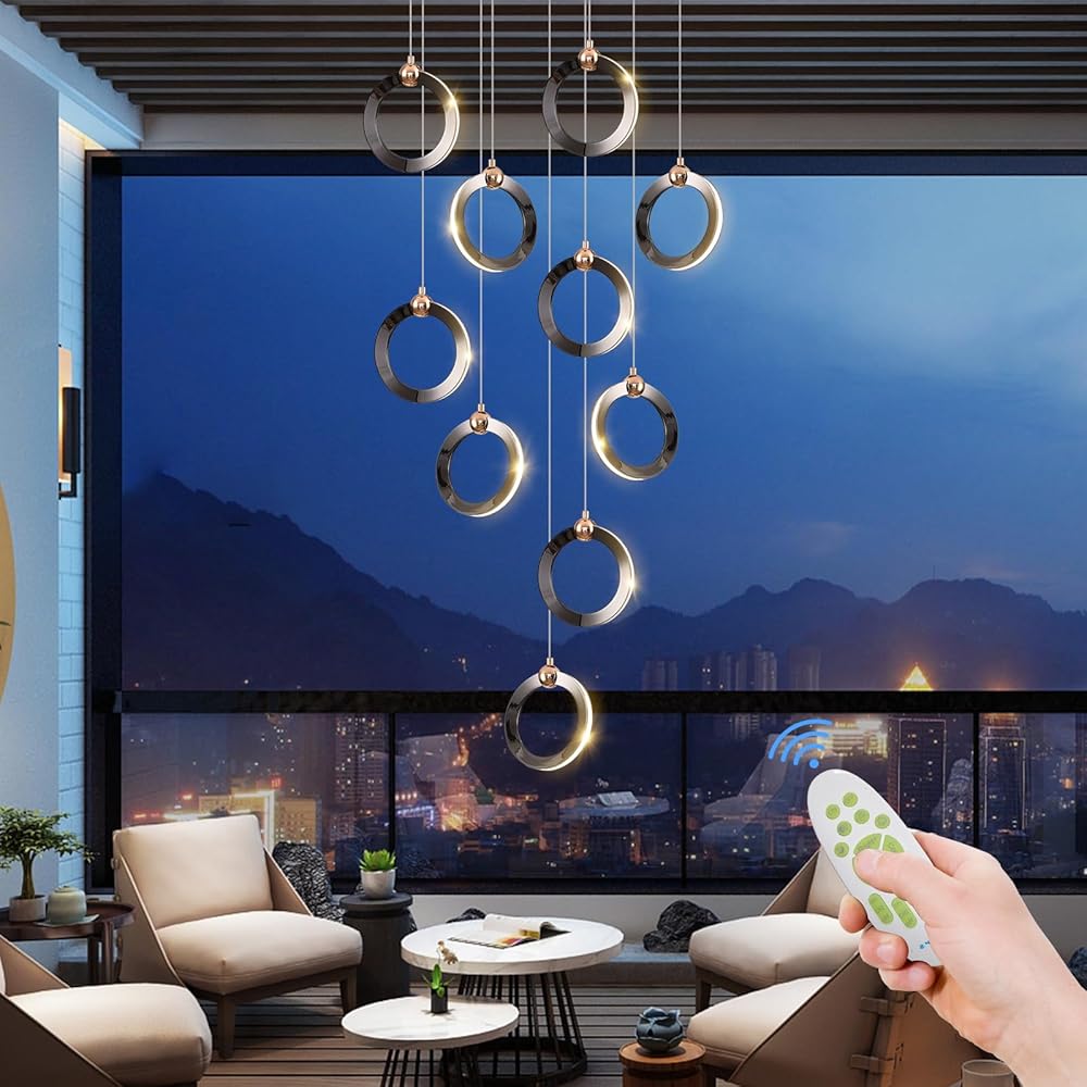 Modern Chandelier Dimmable 10 Rings Electroplating Process with Remote Control, Height Adjustable Creative Acrylic Lampshade Elegant Artistic Home Decor for Staircase Foyer High Ceiling Living Room