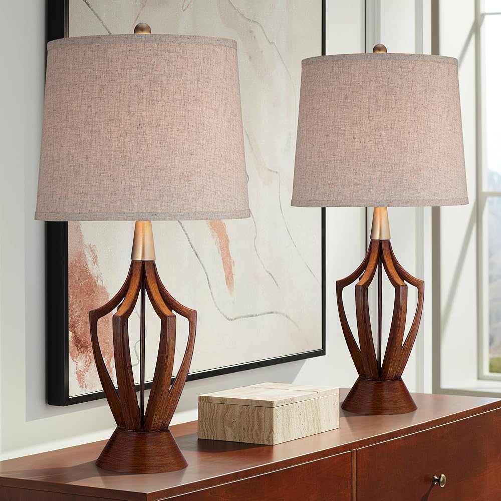 360 Lighting St. Claire 30 3/4" Tall Open Base Large Mid Century Modern End Table Lamps Set of 2 Wood Finish Fabric Shade Living Room Bedroom Bedside Nightstand House Office Home Reading Kitchen