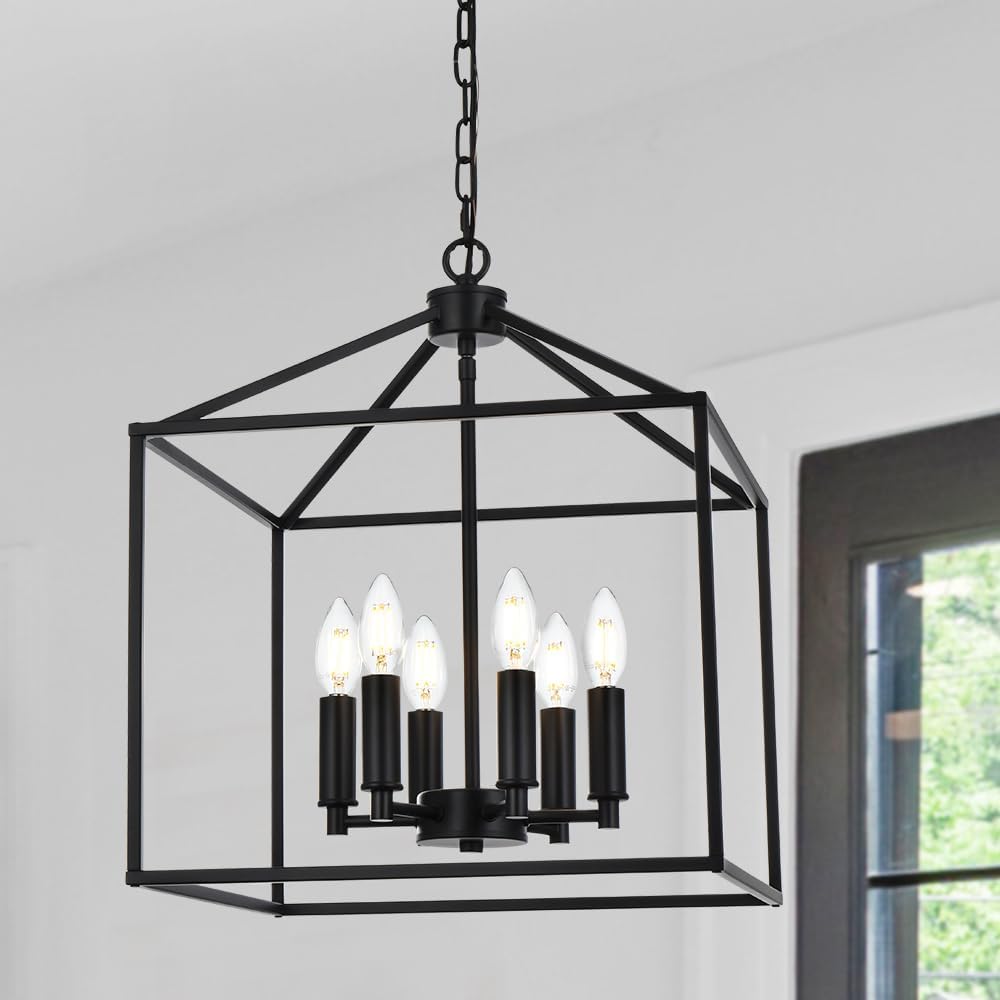 8 Lights Lantern Kitchen Island Lighting Fixture in Matte Black Finish, Industrial Cage Metal Pendant Light for Dining Room Adjustable Height