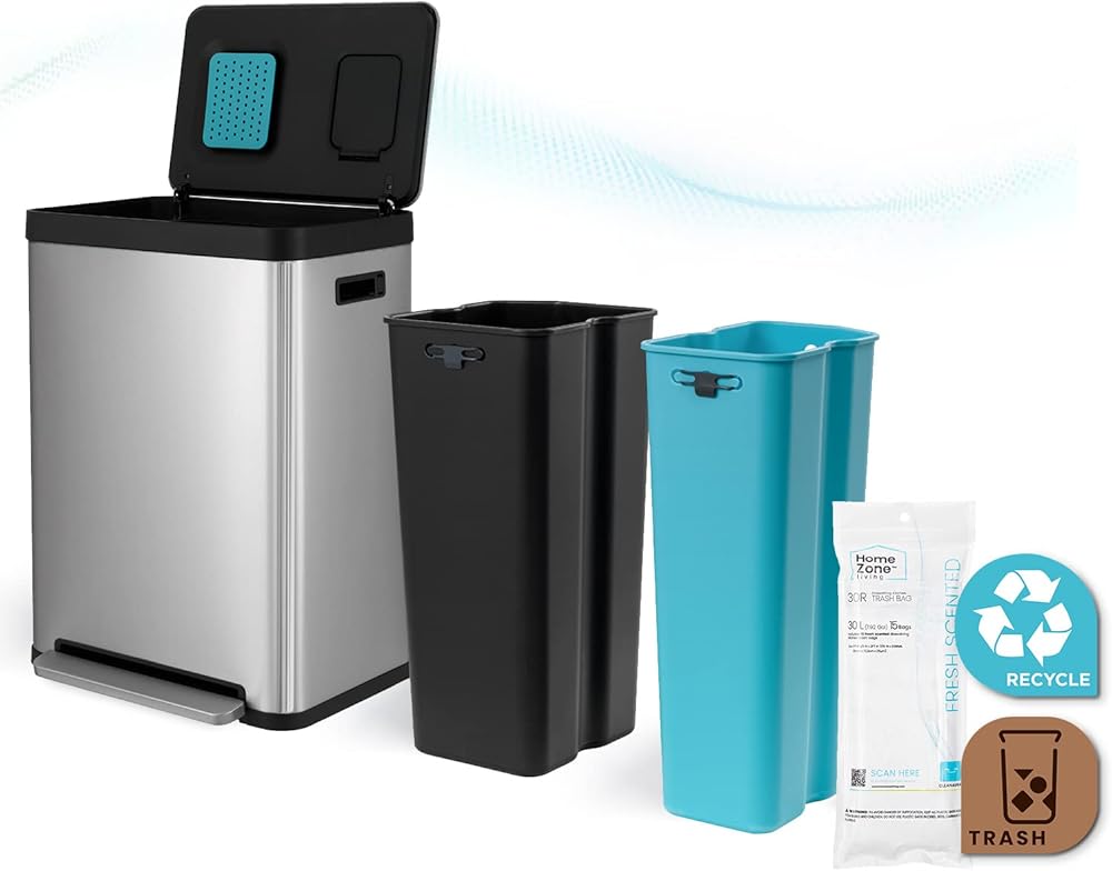 Home Zone Living 18.5 Gallon Kitchen Trash Can, Dual Removable Liners for Recycling and Trash, CleanAura Odor Control, Wide Stainless Steel Shape (10.6 + 7.9 for 18.5 Gallon Total), Silver