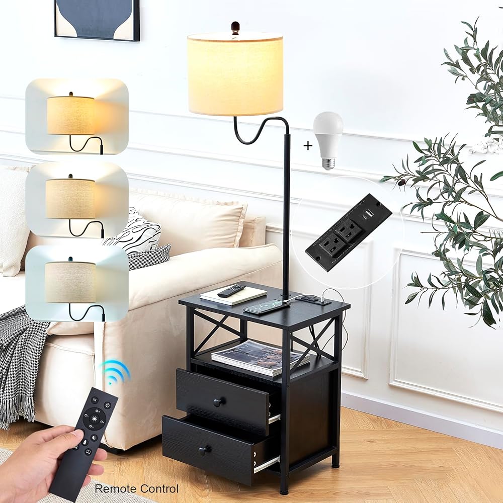 LOKHOM 59" End Table with Lamp, Floor Lamp with Table Attached with 2 Solid Wood Drawers & USB Ports 2 Outlets,Rustic Bedside Nightstand with Stepless Dimmable for Living Room Bedroom(Bulb Included)