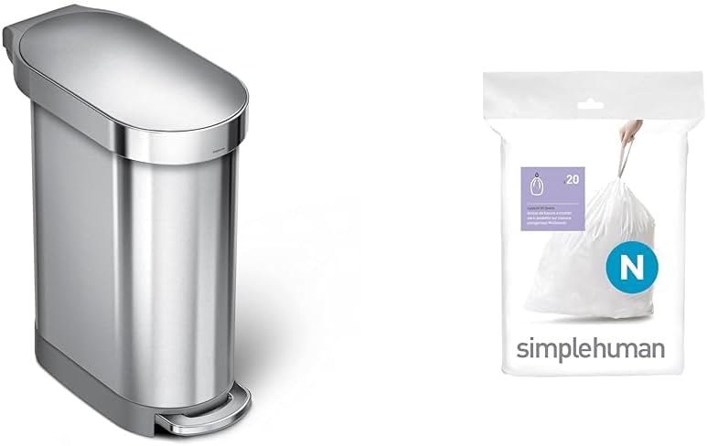simplehuman 45 Liter / 12 Gallon Slim Hands-Free Kitchen Step Trash Can with Liner Rim, Brushed Stainless Steel & Code N Custom Fit Drawstring Trash Bags, 45-50 Liter / 12-13 Gallon, White, 20 Liners