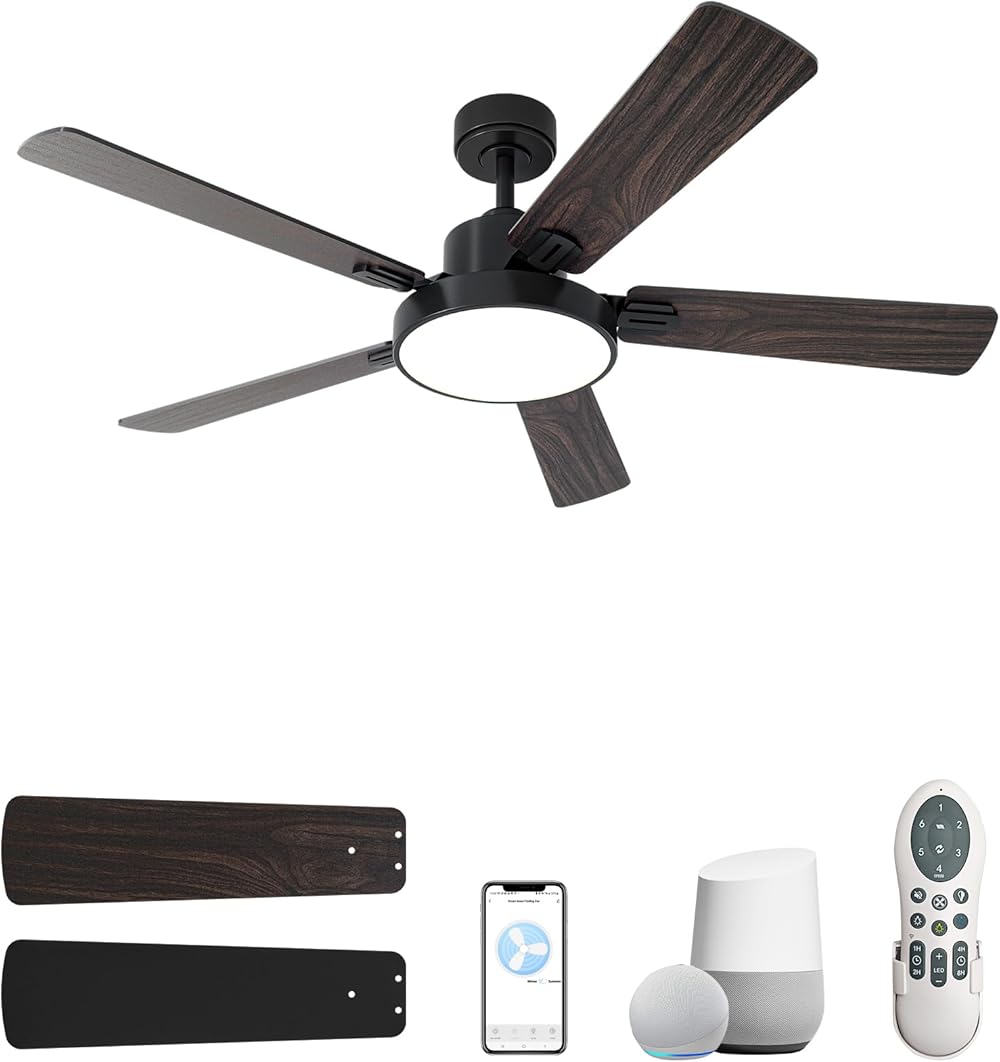 52 Inch Smart Ceiling Fans with Lights Remote, Ceiling Fan High CFM 8176 with Alexa,Voice and App, Quiet DC Motor, ETL Listed, 5 Reversible Dual-Finish Plywood Blades, Black/Walnut