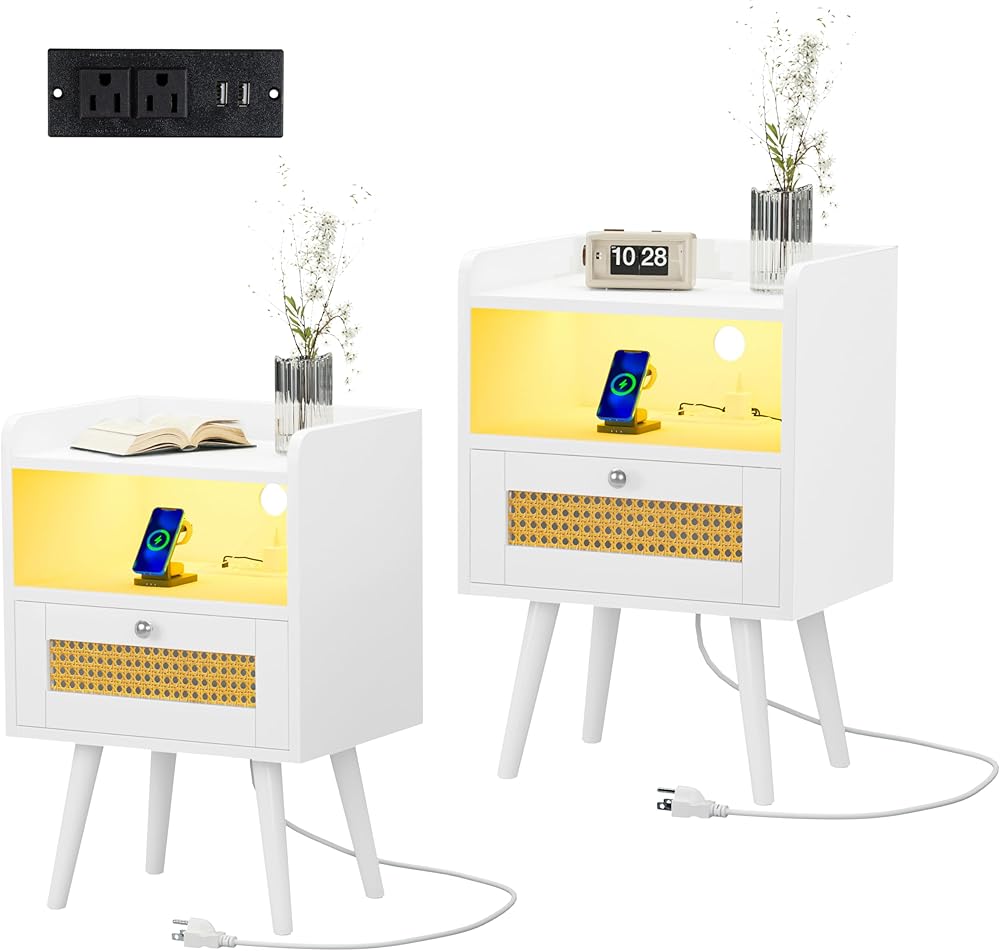 Rattan Nightstands Set of 2, Small End Table with Charging Station and LED Lights, Mid Century Modern Side Table with Storage for Living Room, Bedroom and Small Spaces, White