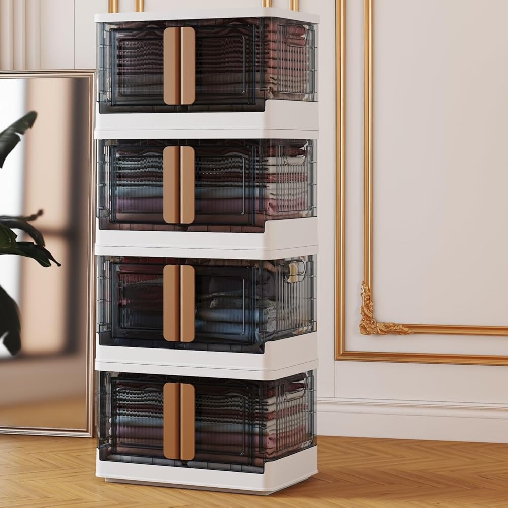 Storage Bins with Lids - 4 Packs 19Gal Plastic Storage Bins for Closet Organizers and Storage, Folding Storage Box, Stackable Storage Bins with Open Front Door, Collapsible Storage Bins with wheels