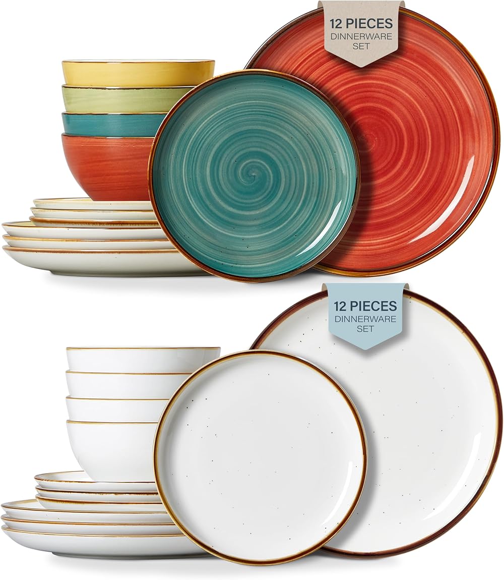 ONEMORE Plates and Bowls Set, Dinnerware Sets for 4, Porcelain Kitchen Dishes Set 12pcs, Scratch Resistant, Modern Aesthetic Plate Set - Microwave & Dishwasher Safe