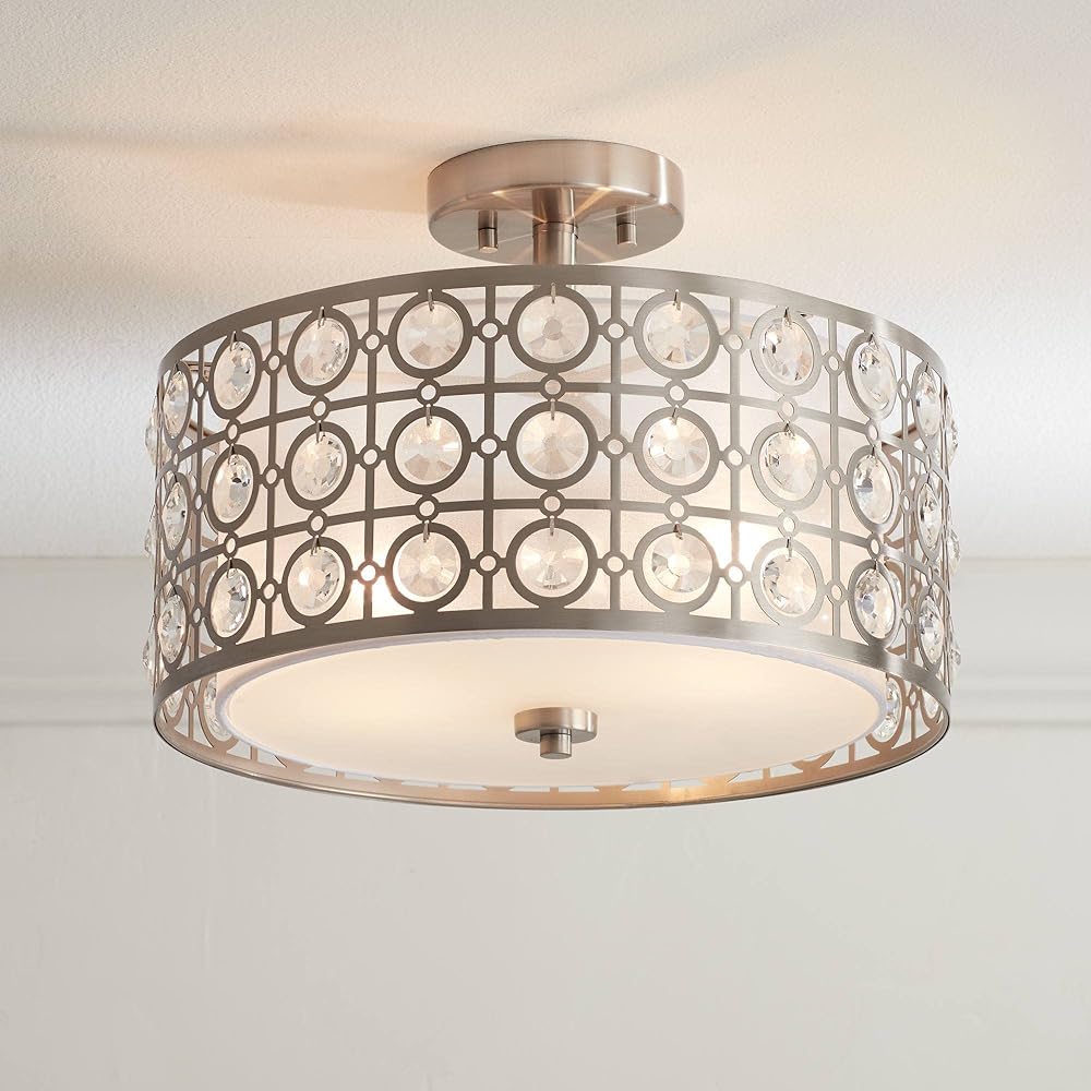 Saira Modern Close to Ceiling Light Semi Flush Mount Fixture 16" Wide Brushed Nickel Clear Crystal Accent Organza Drum Shade for Bedroom Hallway Living Room Dining Room Bathroom