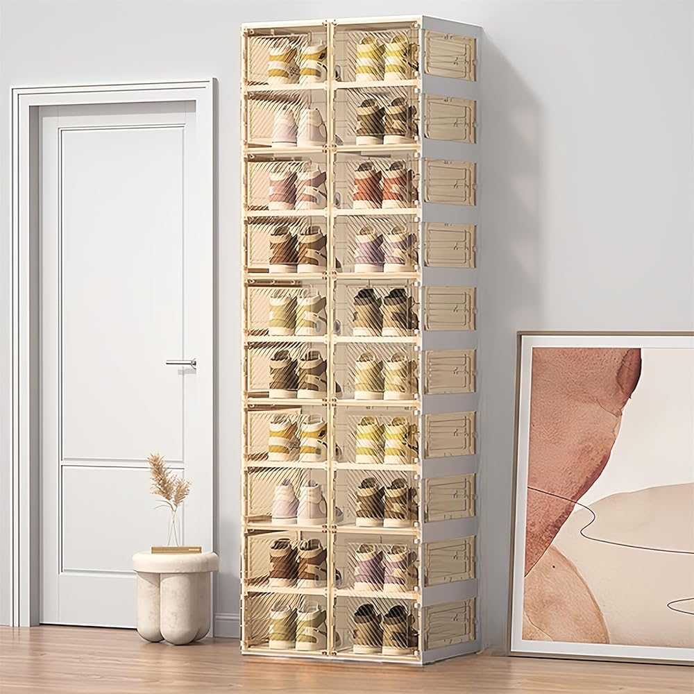Shoe Organizer Storage Box, Portable Folding Shoe Rack with Magnetic Clear Door All-in-one Sturdy Easy Assembly Sneaker Cabinet Bins (10 Layers-20 Grids)
