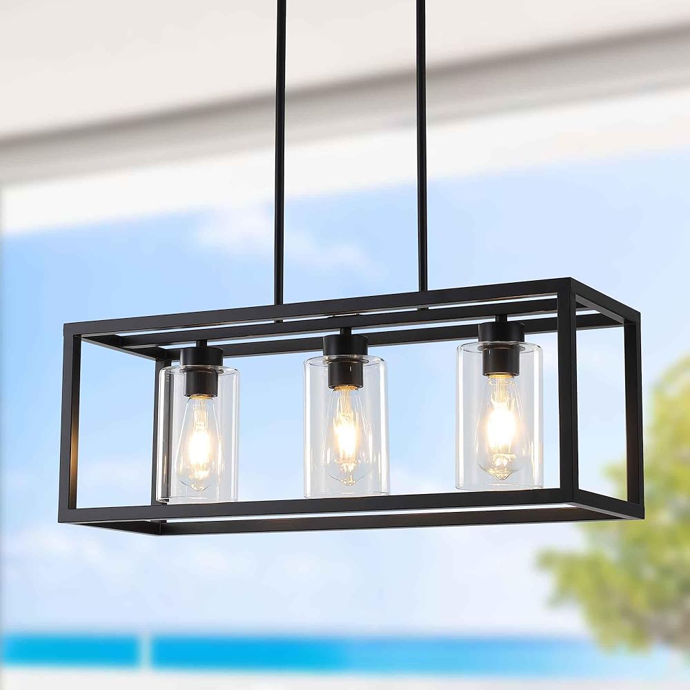 3 Light Black Chandeliers Dining Room Light Fixture, Farmhouse Chandelier Over Table Rectangular Kitchen Island Pendant Lights, Modern Ceiling Light with Glass Shade Adjustable Rods