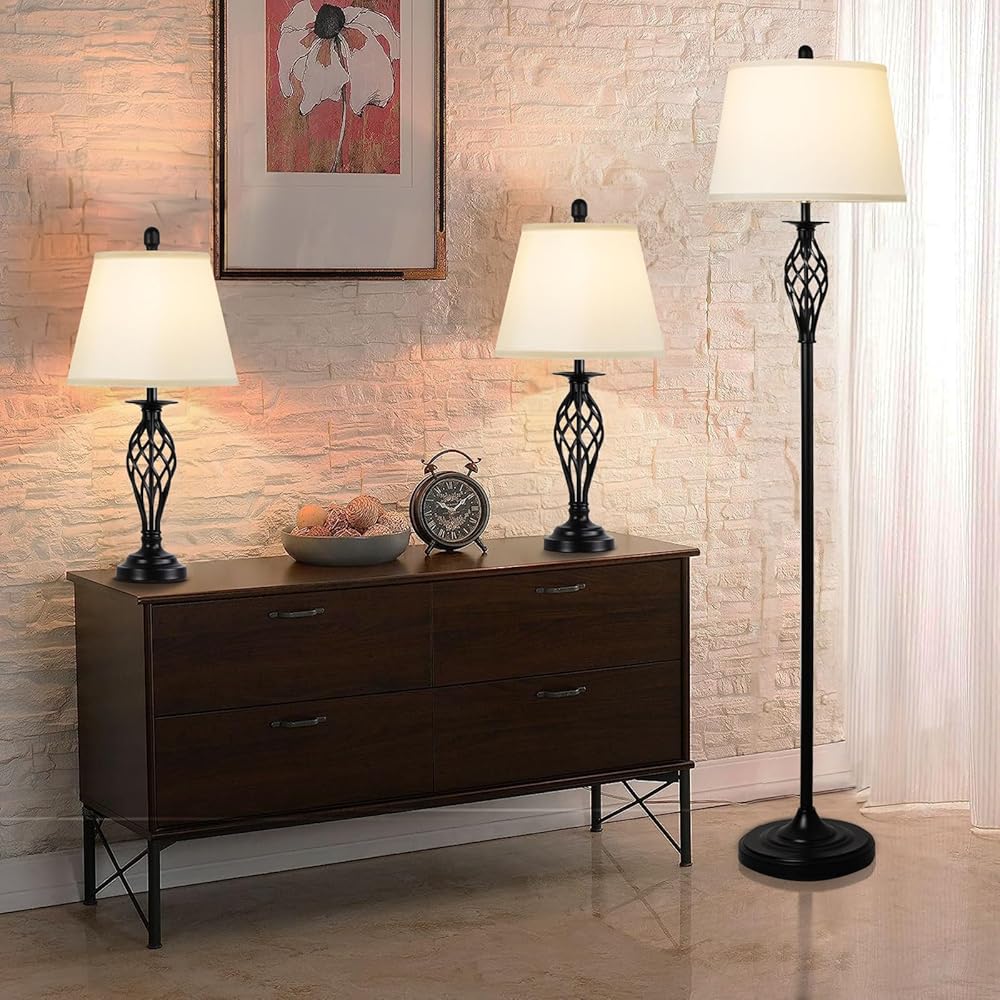 Depuley Lamp Sets of 3 for Living Room, Farmhouse 2 Tables and Floor Lamp Set, Modern Lamp Sets for Bedroom, Metal 3-Piece Lamp Set with White Linen Lampshade, Black Finish