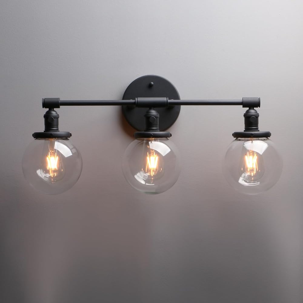 Phansthy 3 Light Wall Sconce Bathroom Vanity Light Black Sconce Light Fixture with 5.6 Inches Round Glass Canopy, Black