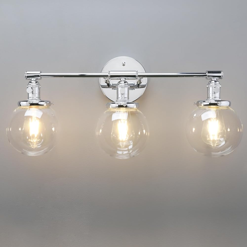 Phansthy Industrial 3 Lights Wall Sconce Modern Bathroom Vanity Light Fixture with On Off Switch and Three 5.9 Inches Diameter Globe Glass Lampshade (Chrome)