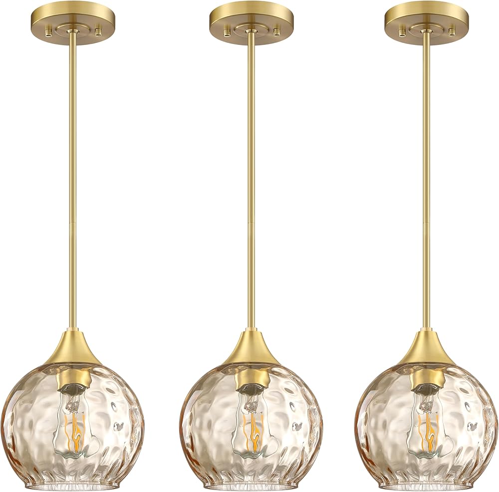 3 Pack 1 Light Hanging Indoor Kitchen Island Pendant Light 6.3" Clear Hammer Amber Glass Pendant Ceiling Light Fixture,Brushed Bronze Finish Modern Farmhouse Dinning Over Sink