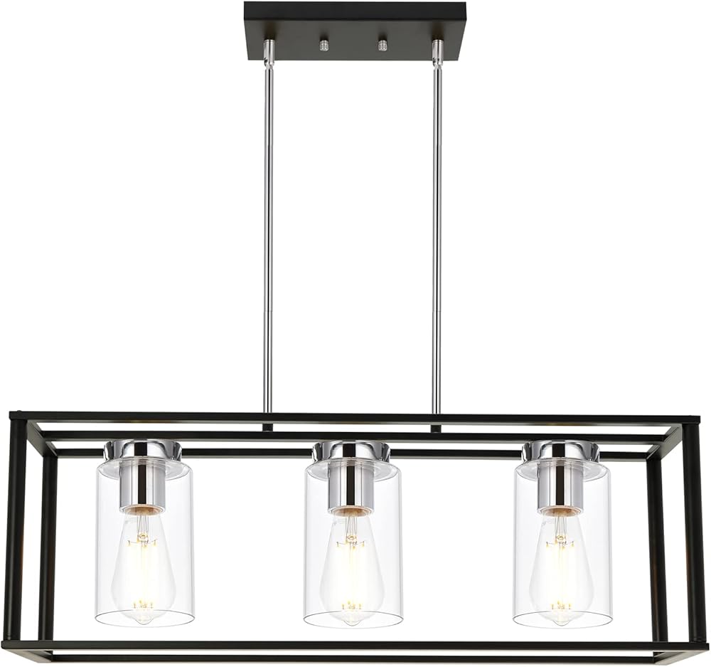 VINLUZ 3 Light Black and Chrome Finish Kitchen Island Light,Adjustable Hanging Pendant Lighting with Clear Glass Shades Rectangular Dining Room Chandeliers Adjustable Height