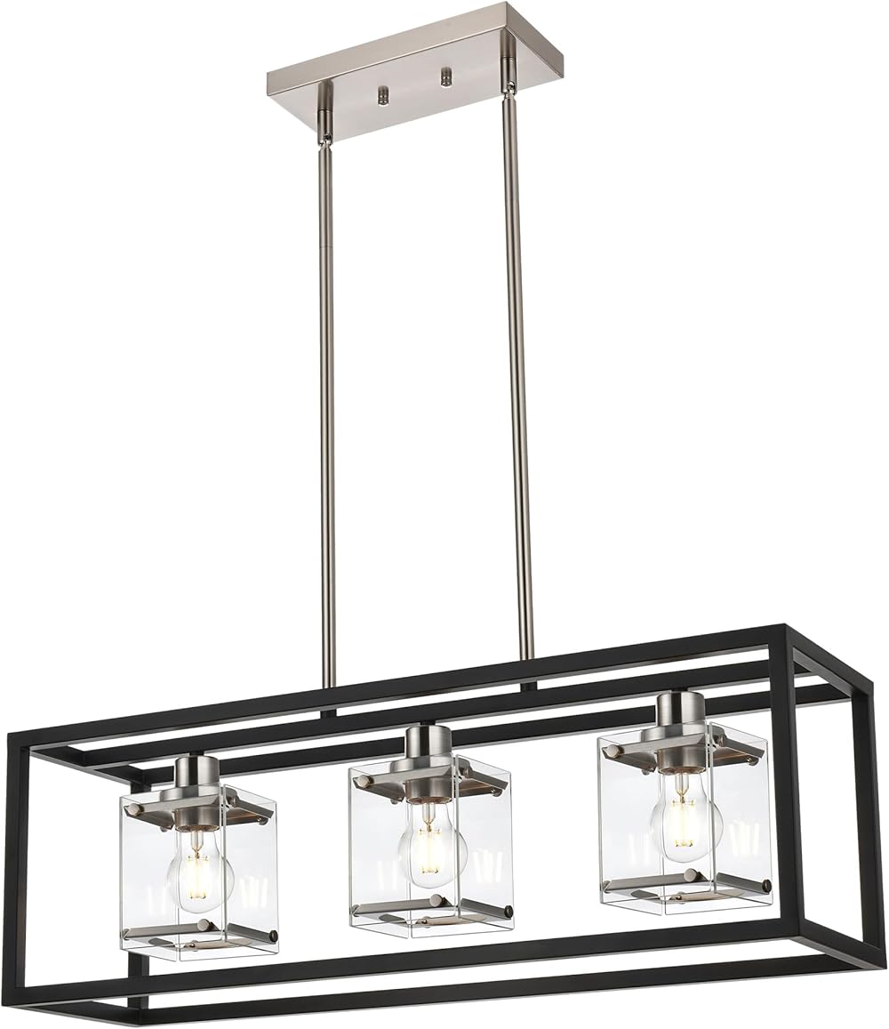 MELUCEE 3 Lights Rectangle Chandeliers Black Brushed Nickel 26 Inches Kitchen Island Light Fixtures Ceiling Hanging Farmhouse Dining Room Lights Over Table, Rectangular Clear Glass Shade