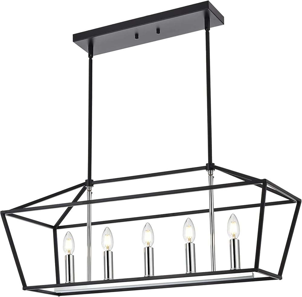 MELUCEE Farmhouse Chandelier Linear Lighting Rod Hanging Black and Chrome Finish, 5-Light Kitchen Island Light Fixture 32 Inch Rustic Chandelier for Dining Room Living Room Pool Table, E12 Base