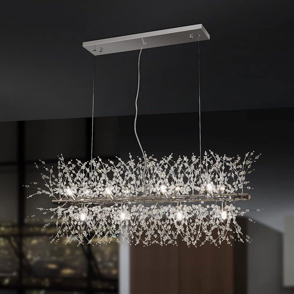 Modern Crystal Firework Chandelier, Linear Dining Room Lighting Fixtures Hanging, Chrome Dandelion Chandelier LED Pendant Lighting for Dining Room, Bedroom, Living Room (12-Light, 35.5" Chrome)