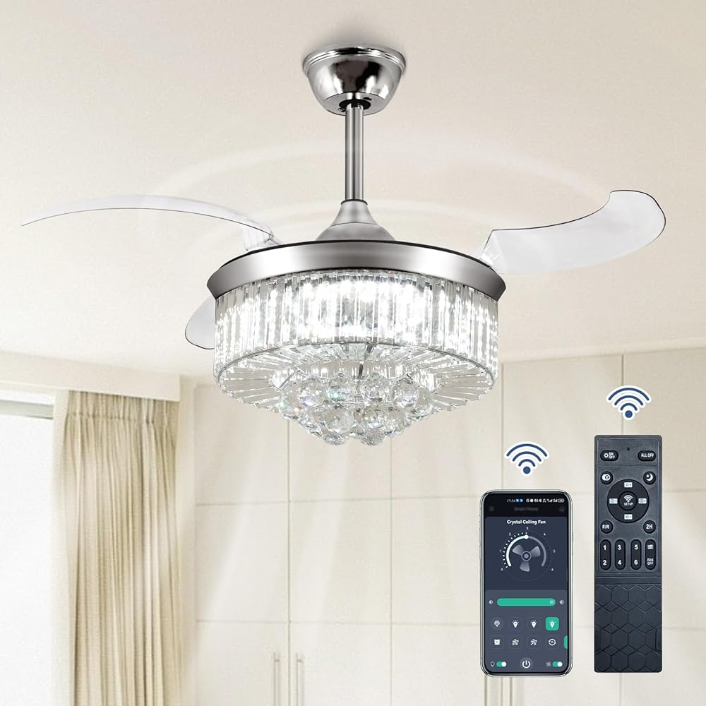Dimmable Retractable Ceiling Fan: Chandelier Fan Light Fixture with App Remote - Modern Chrome Crystal Fandelier Ceiling Light for Bedroom Living Room - 6 Speed DC Motor Timer 36"