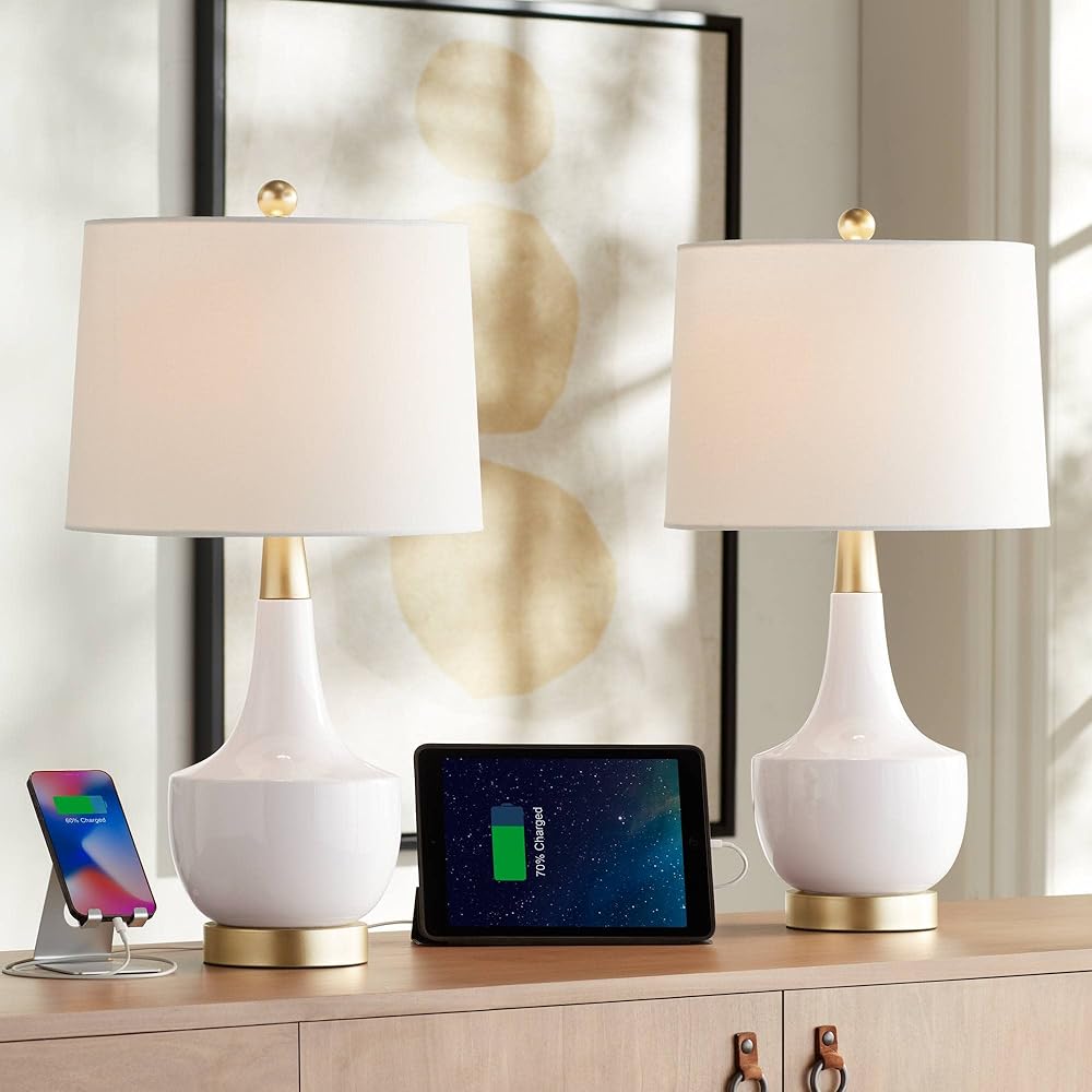 360 Lighting Nesbit 25" High Mid Century Modern Table Lamps Set of 2 USB Port White Gold Ceramic Metal Fabric Shade Living Room Charging Bedroom Bedside Nightstand House Office Home Reading Kitchen