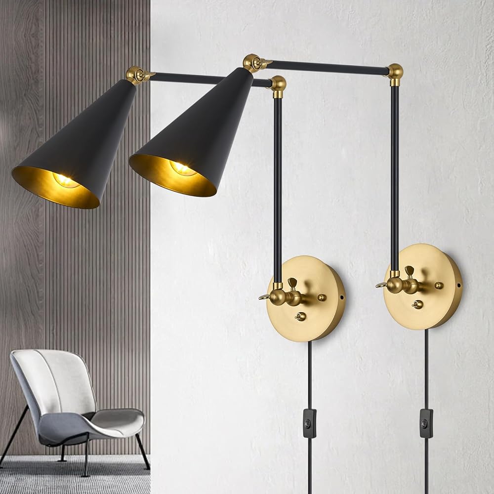 swing arm wall sconce,Brushed Brass Wall Sconce Swing Arm Wall Lights Plug in Wall Mounted Light with 6FT Plug in Cord,Wall Mounted Reading Light Fixture Bedside Lamp,40W (2 pack)
