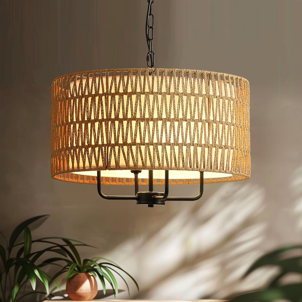Rattan Farmhouse Chandelier, 4-Lights Boho Large Pendant Light, Large Wicker Chandelier Light Fixtures, Hand Woven Chandeliers, for Dining Room,Bedroom Living and Kitchen Island