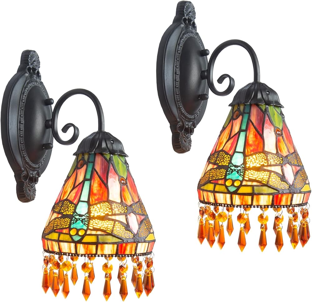 Traditional Tiffany Style Wall Sconce 12" Tall 2pc Set Dragonfly Antique Bronze Finish Sconce Handcrafted Beaded Art Glass Shade for Home Décor, Hallway, Foyer and Home Office