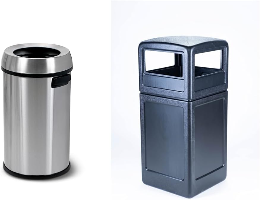 SIMPLI-MAGIC 65 Liter Stainless Steel Open Top Trash Can and 42 Gallon Black Square Waste Container Bundle