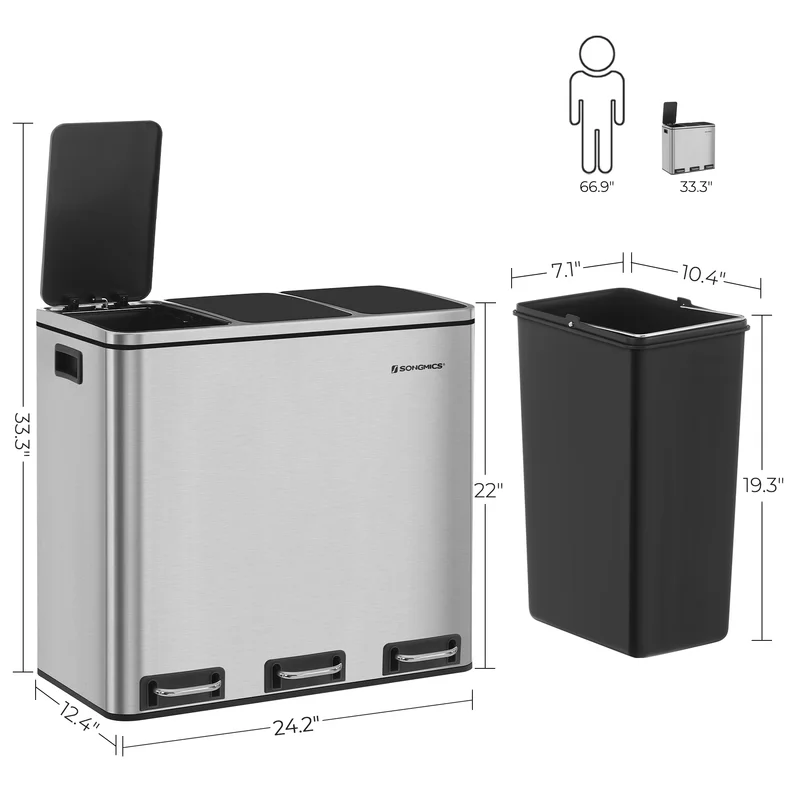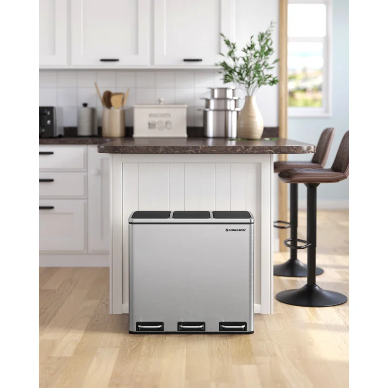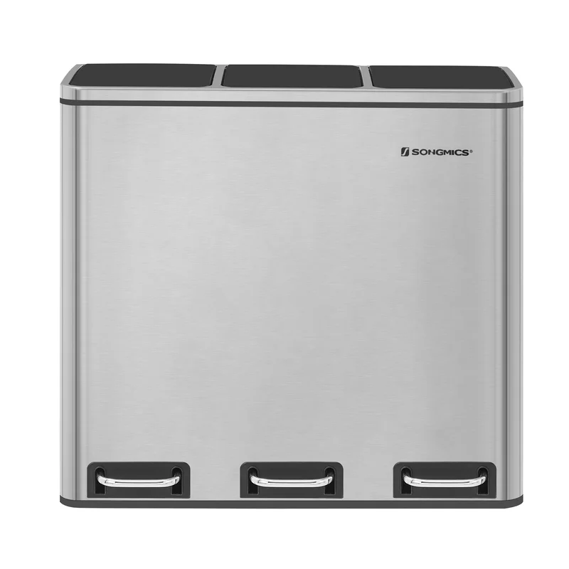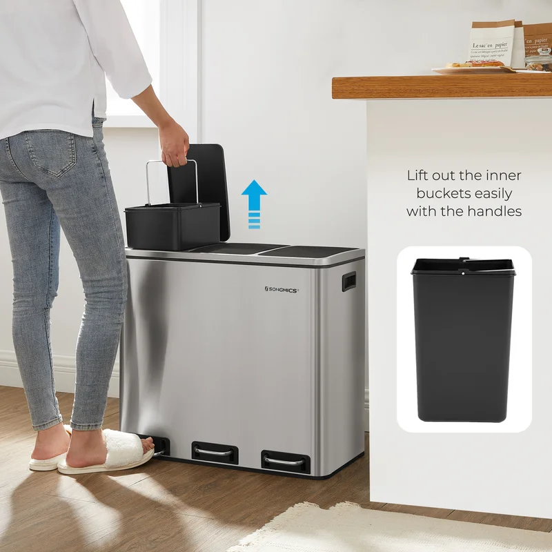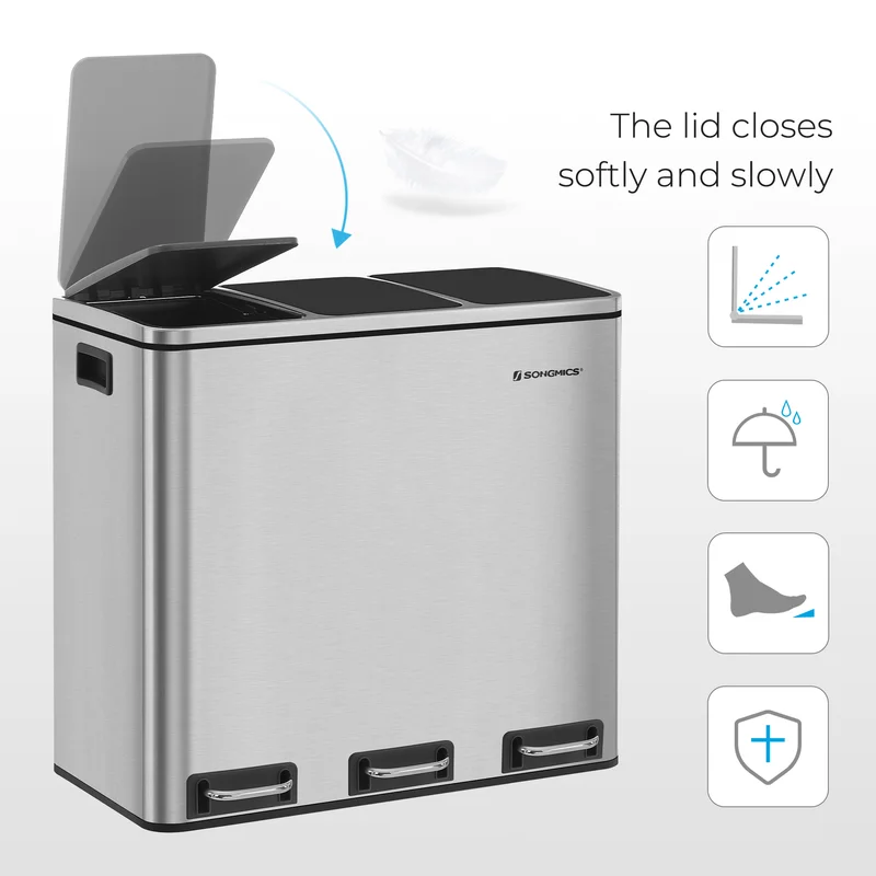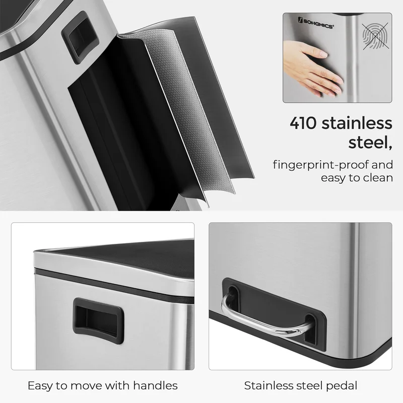 SONGMICS ULTB54NL Trash Can, 3 x 4.8 Gallon Garbage Can, 14.4 Gallon Recycle Bin with Soft-Close Lids, Pedals, and Inner Buckets for Kitchen, Stainless Steel, Silver and Black