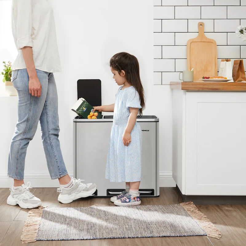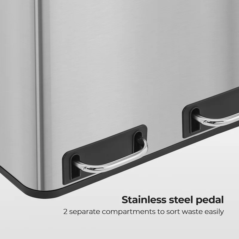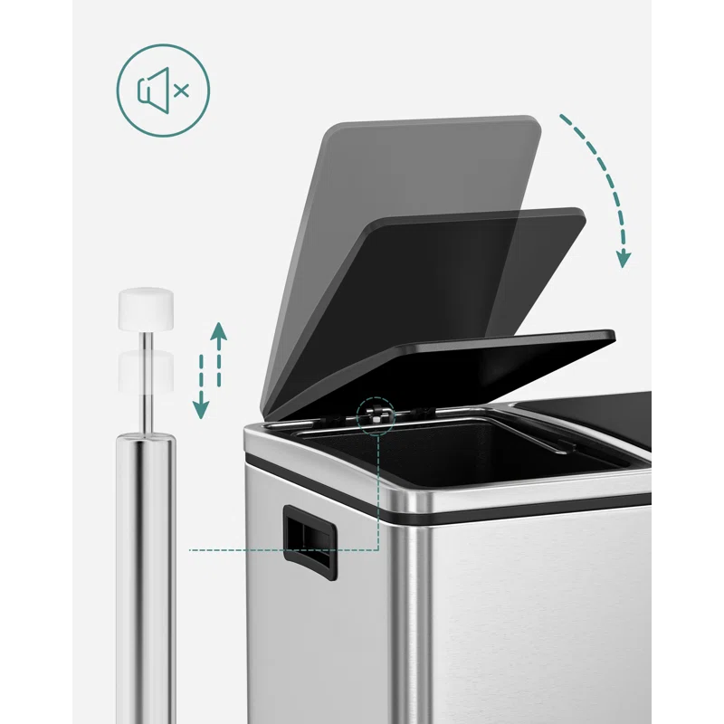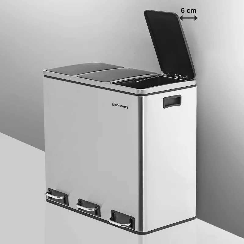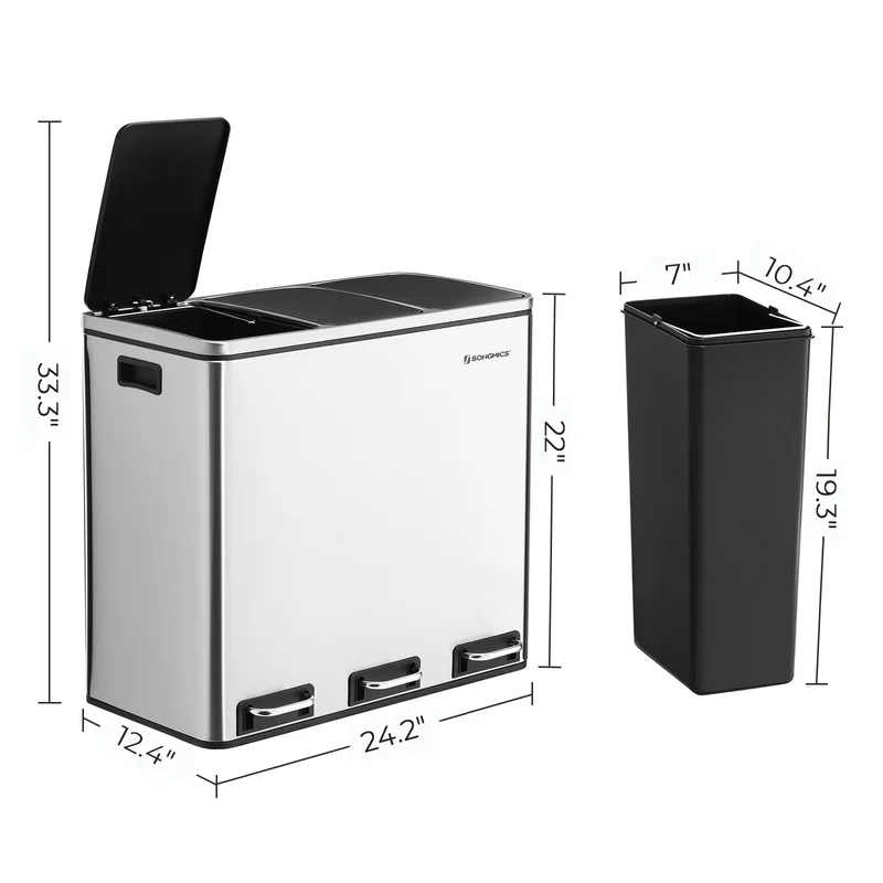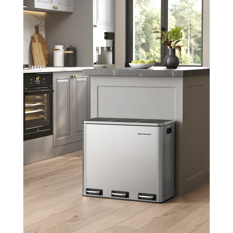 SONGMICS ULTB54NL Trash Can, 3 x 4.8 Gallon Garbage Can, 14.4 Gallon Recycle Bin with Soft-Close Lids, Pedals, and Inner Buckets for Kitchen, Stainless Steel, Silver and Black