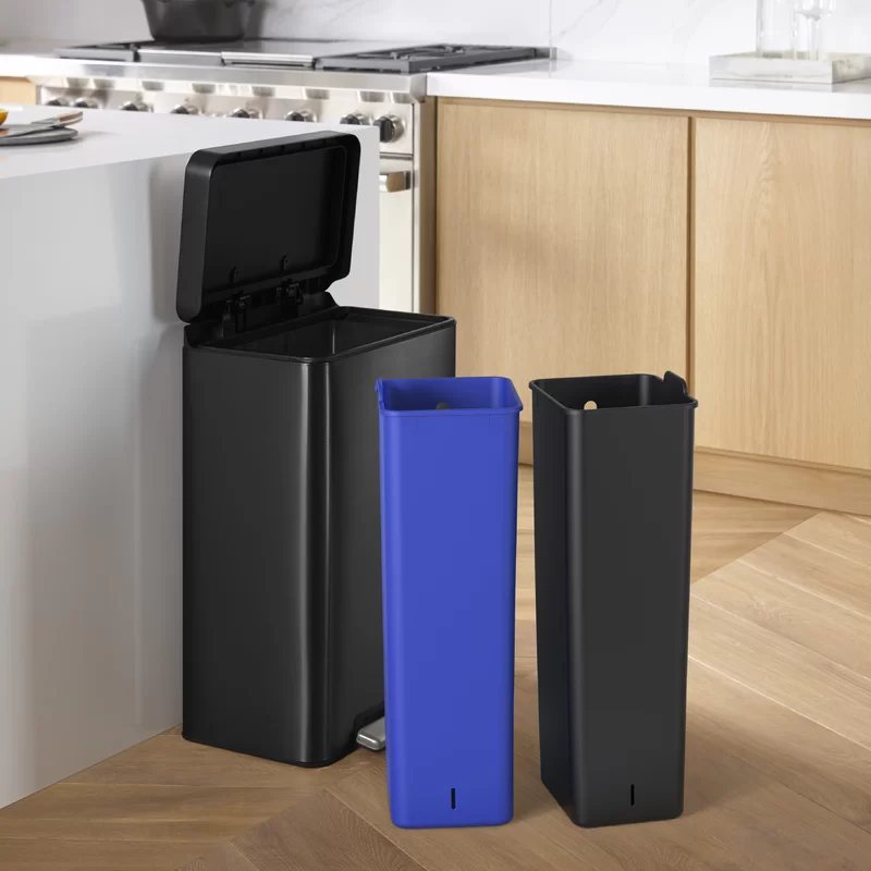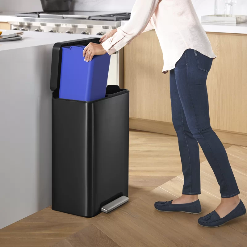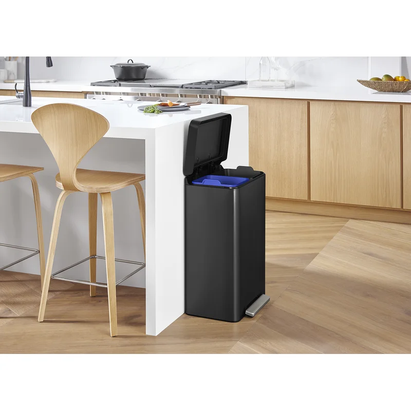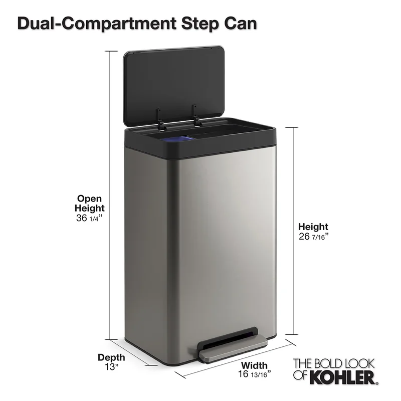 Kohler 20956-BST Step Trash Can, 11 Gallon, Dual Compartment, Black with Stainless Steel