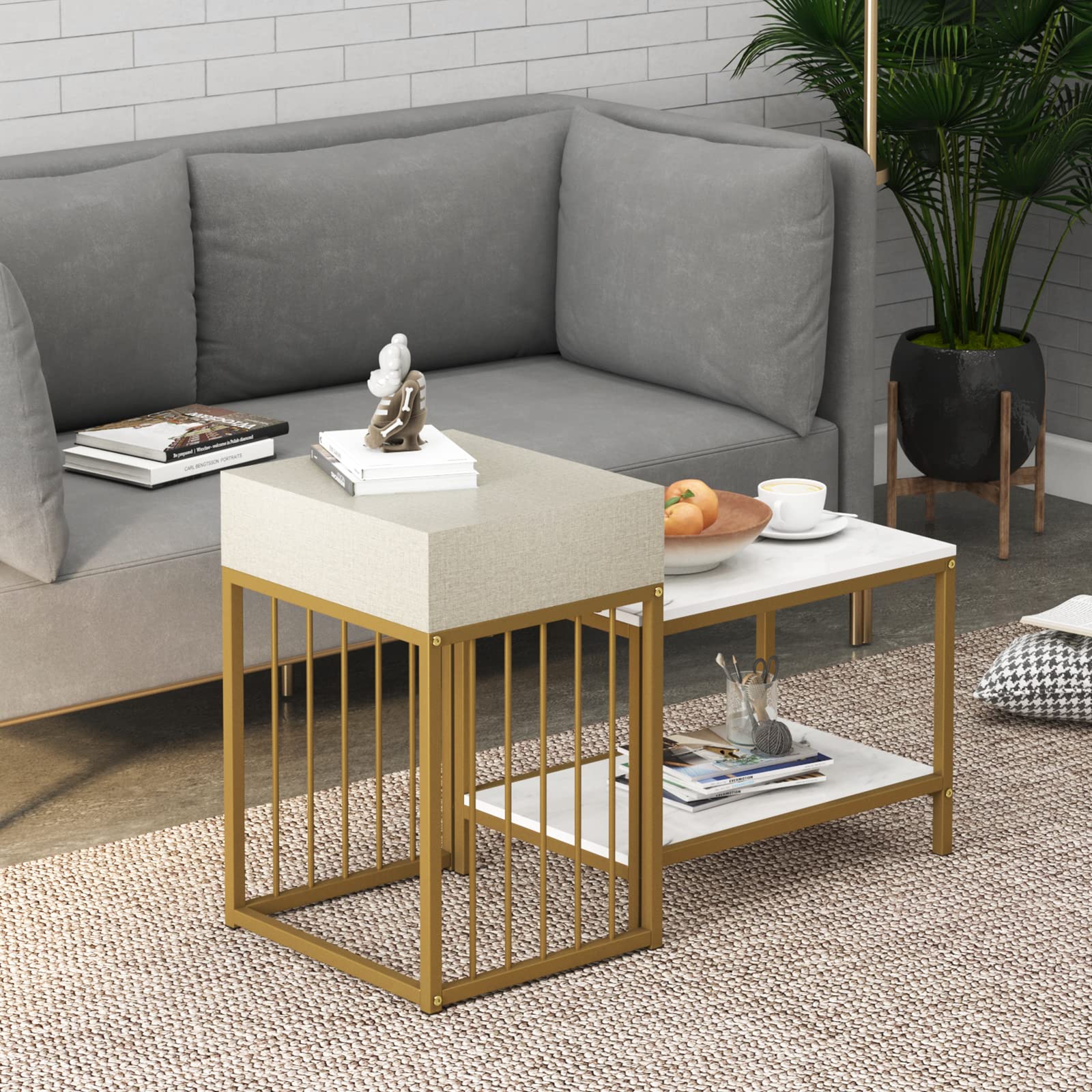 2 in 1 Compact Nesting Coffee End Table Set with Storage Drawer