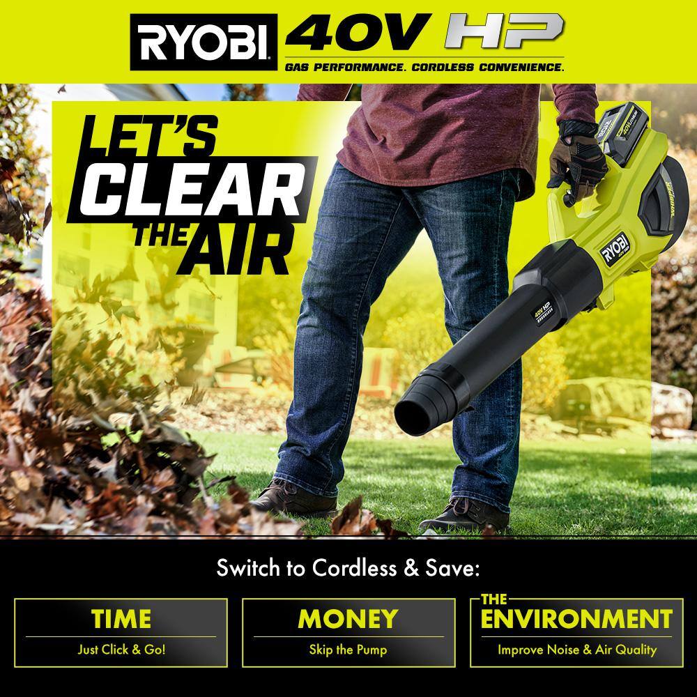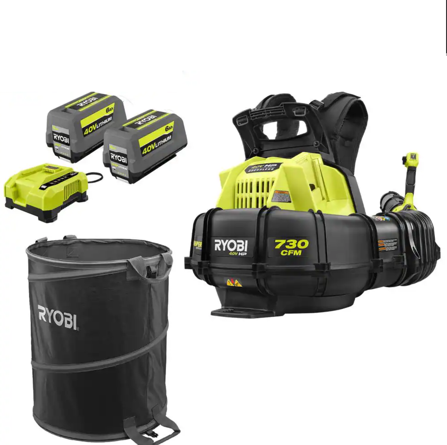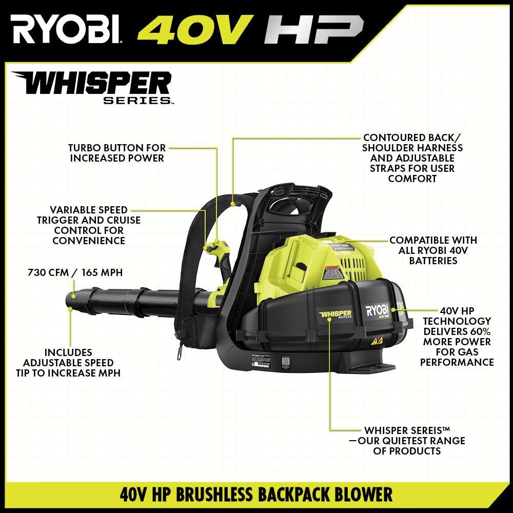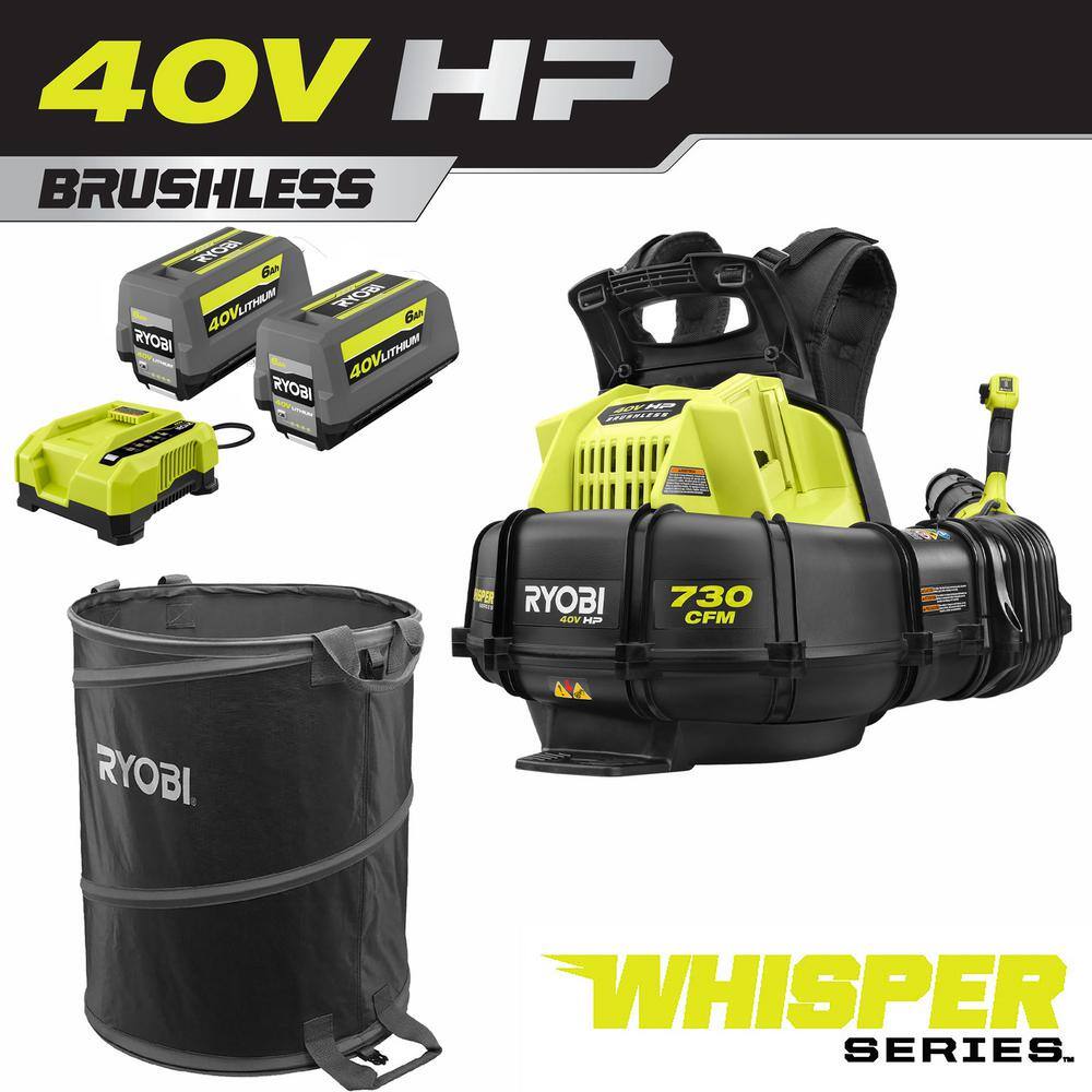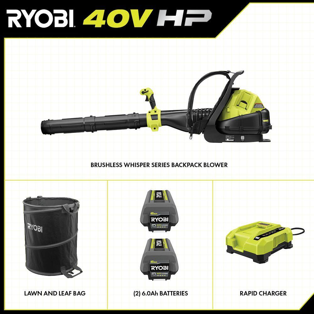 RYOBI RY404170-LB 40V HP Brushless 165 MPH 730 CFM Backpack Blower w/ Lawn and Leaf Bag, (2) 6.0 Ah Batteries and Charger