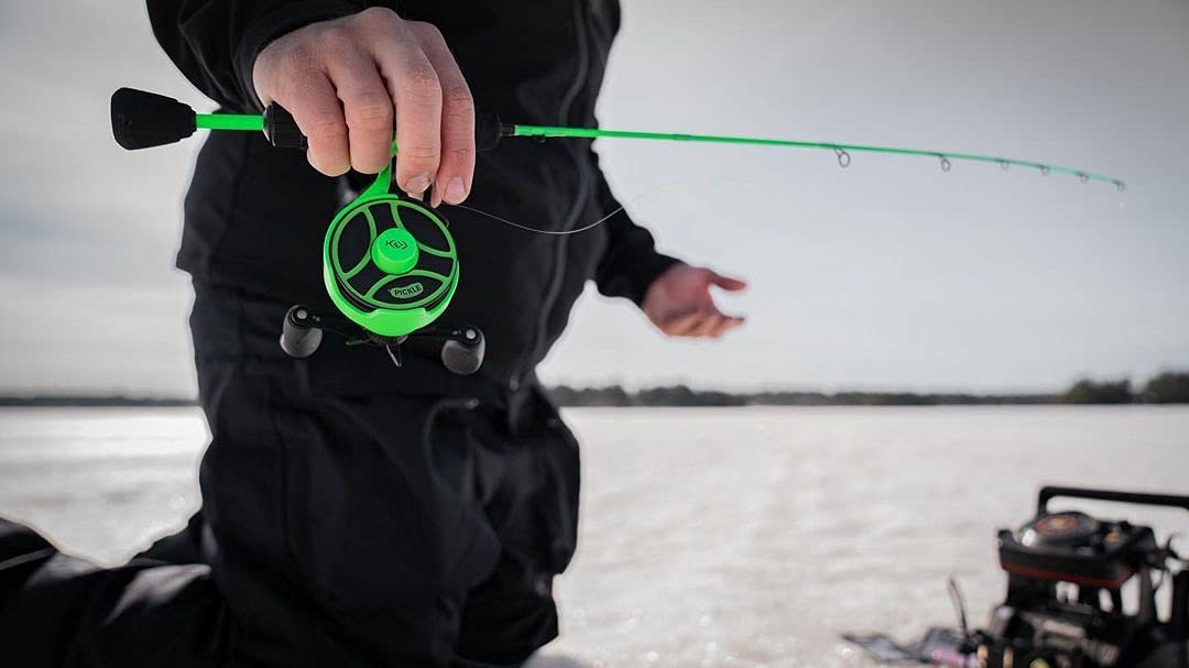 13 Fishing Radioactive Pickle Ice Inline Fishing Combo, Left Hand Retreive, 27′′ UL (Ultra Light)