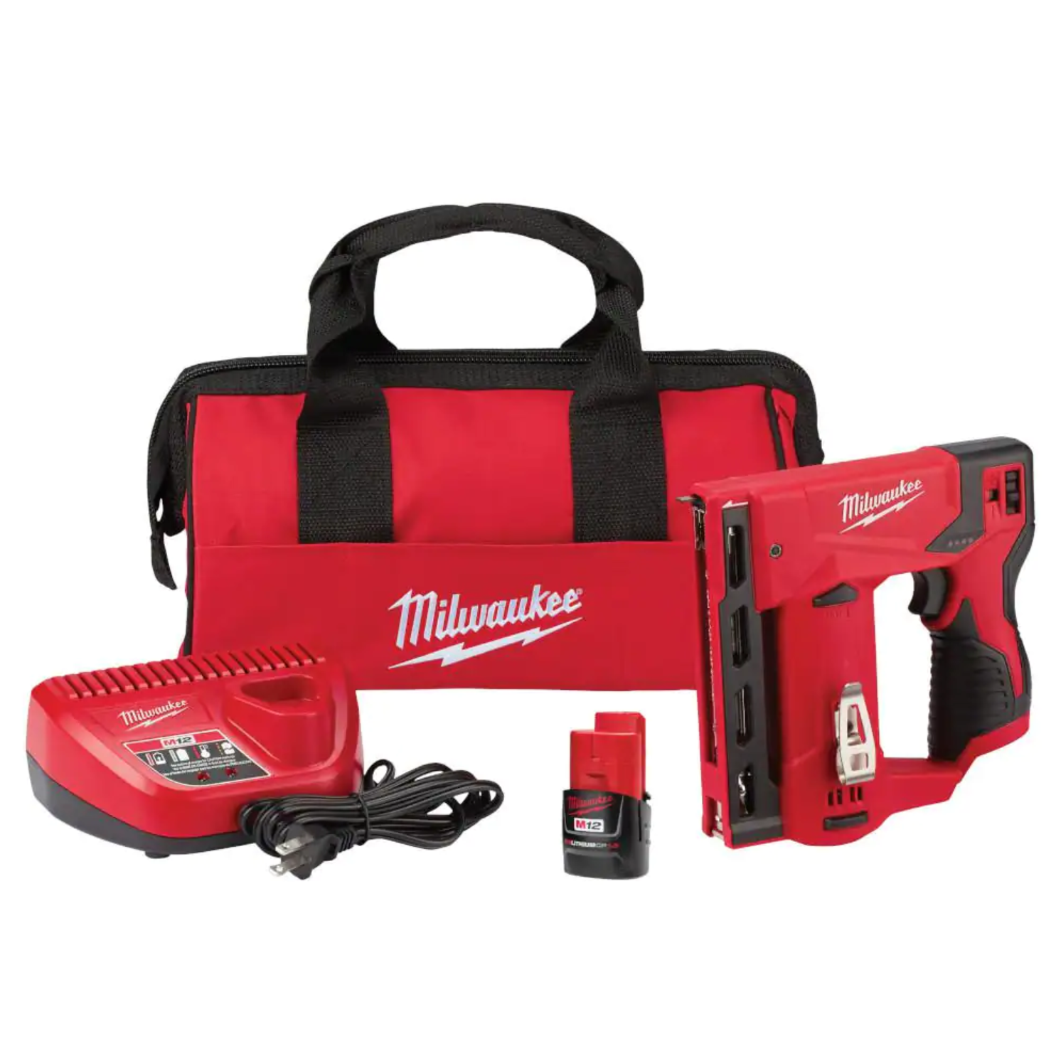 Milwaukee 2447-21 M12 12V Lithium-Ion Cordless 3/8 in. Crown Stapler Kit W/ (1) 1.5Ah Battery, Charger & Bag