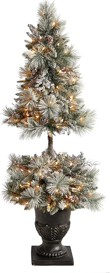 5ft. Flocked Artificial Porch Christmas Tree with 100 LED Lights and 186 Bendable Branches in Decorative Urn