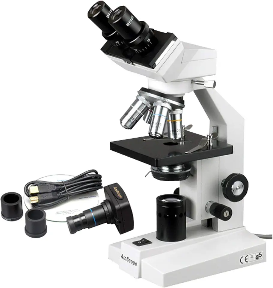 AmScope B100B-M Digital Compound Binocular Microscope, 40X-2000X Magnification, Brightfield, Tungsten Illumination, Abbe Condenser, Plain Stage, Includes 1.3MP Camera with Reduction Lens and Software