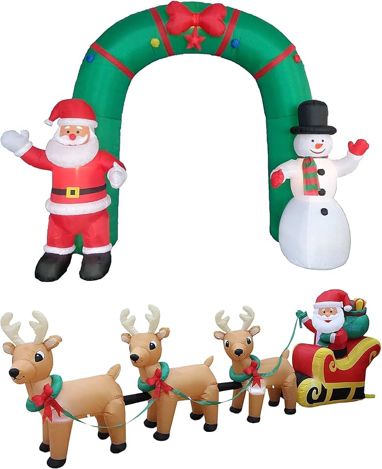 Two Christmas Party Decorations Bundle, Includes 10 Foot Tall Inflatable Santa Claus Snowman Archway, and 12 Foot Long Inflatable Santa Claus on Sleigh 3 Reindeer & Gift Bag Blowup with Lights