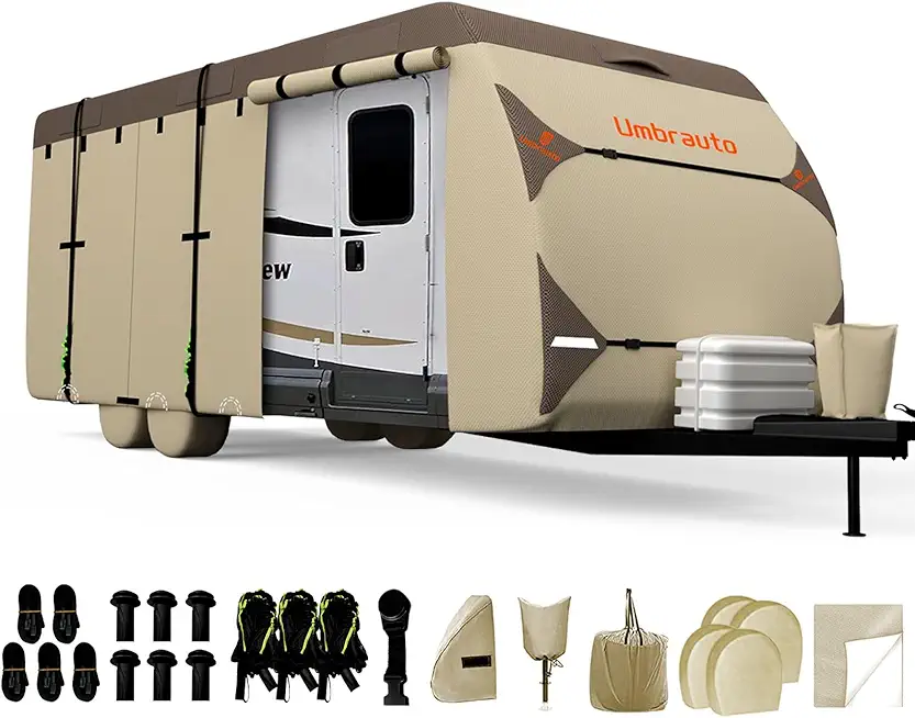 Umbrauto Travel Trailer RV Cover 2024 Upgraded 7 Layers Top 3 Layers Side Waterproof Camper Cover for 33' to 35' RV with 4 Trailer Tire Covers,Tongue Jack Cover,Gutter Cover and Extra Windproof Ropes