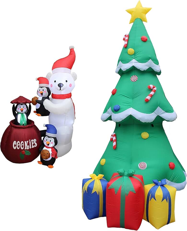 Two Christmas Party Decorations Bundle, Includes 6 Foot Tall Animated Inflatable Polar Bear and Three Penguins Cookies Jar, and 12 Foot Tall Inflatable Huge Christmas Tree with Star and Gift Boxes
