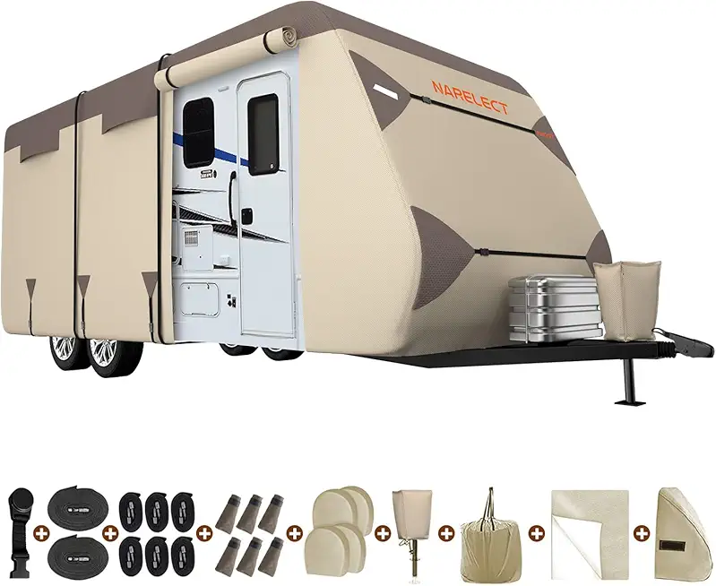 RV Cover Travel Trailer Cover, Extra-Thick Upgraded 7 Layers Top Windproof Camper Cover for 23-24ft, Anti-UV RV Cover Toy Hauler Cover with Tire Cover Gutter Cover