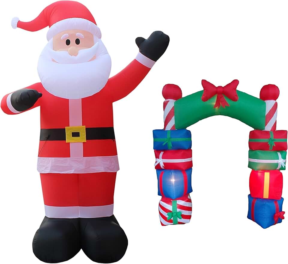 TWO CHRISTMAS PARTY DECORATIONS BUNDLE, Includes 14 Foot Tall Huge Inflatable Santa Claus, and 8 Foot Tall Inflatable Stacked Colorful Gift Boxes Archway with Red Bow Outdoor Indoor Blowup with Lights