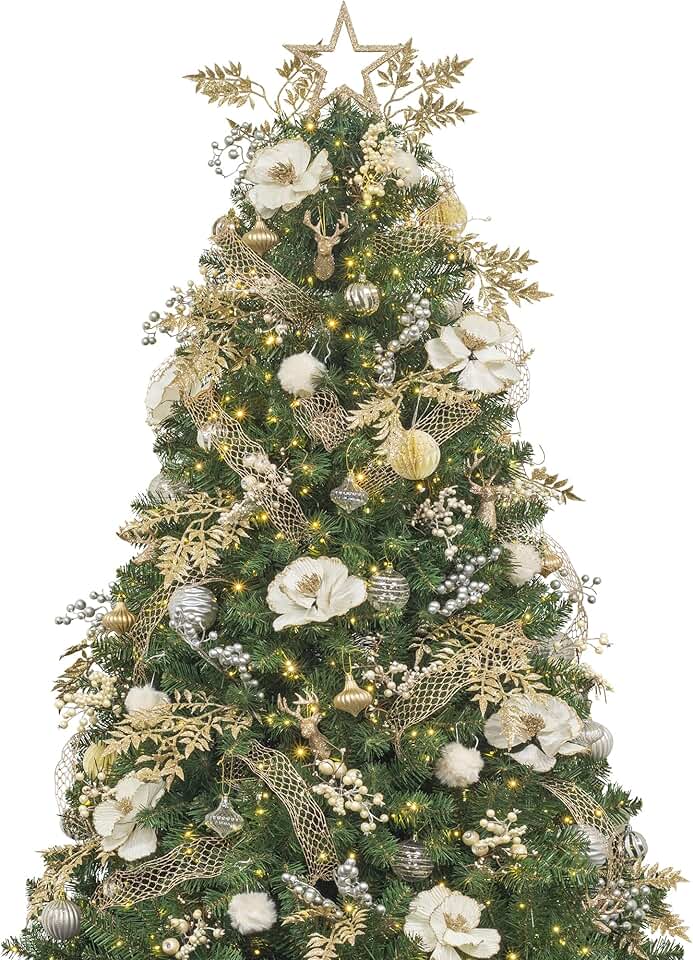 7ft Christmas Tree with Decorations and Lights Remote and Timer Champagne Christmas Tree Decorations Including 7 Feet Full Tree, Ornaments, USB LED String Lights