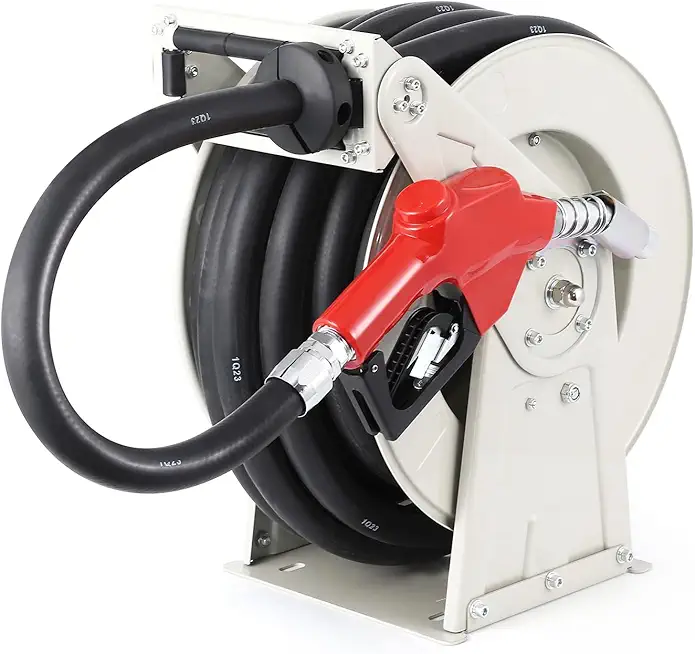Garvee 1"x50" Fuel Hose Reel with Fueling Nozzle, Retractable Heavy Duty Steel Construction Reel, 300PSI Industrial Auto Swivel, Spring Driven Diesel Hose Reel for Construction, with Cover Waterproof