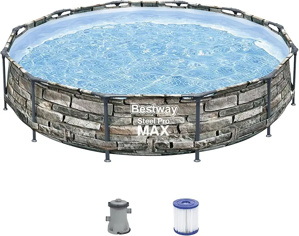 Bestway 56817E 12' x 30" Steel Pro Max Round Steel Frame 5-Person 1,710 Gallon Above Ground Swimming Pool Kit with Filter Pump and Filter, Stone Print