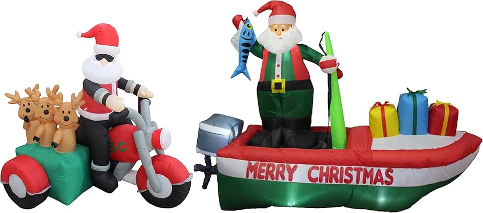 Two Christmas Party Decorations Bundle, Includes 6 Foot Long Inflatable Santa Claus and 3 Reindeers in a Motorcycle, and 8 Foot Long Inflatable Santa Claus on a Fishing Boat