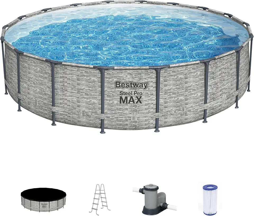 Bestway Steel Pro MAX 18 Foot x 48 Inch Round Metal Frame Above Ground Outdoor Swimming Pool Set with 1,500 Filter Pump, Ladder, and Cover