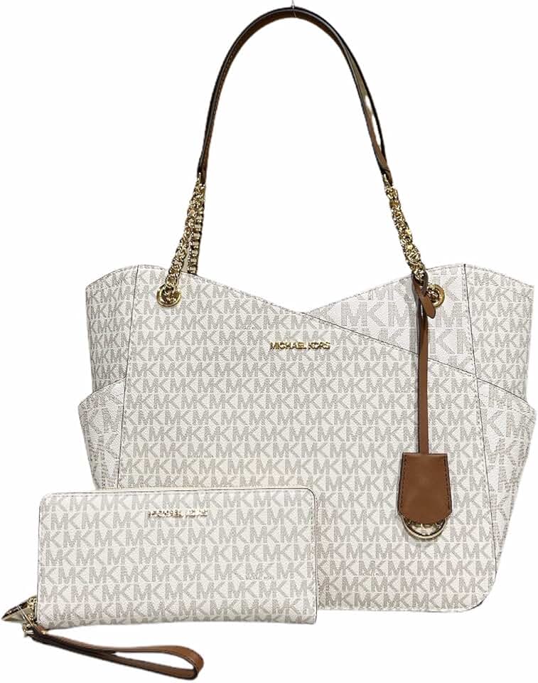 Michael Kors Jet Set Travel Large Chain Shoulder Tote and Continental Wristlet, Vanilla Signature MK