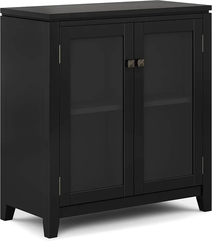 SIMPLIHOME Cosmopolitan SOLID WOOD 30 inch Wide Contemporary Low Storage Cabinet in Black, with 2 Tempered Glass Doors, 2 Adjustable Shelves